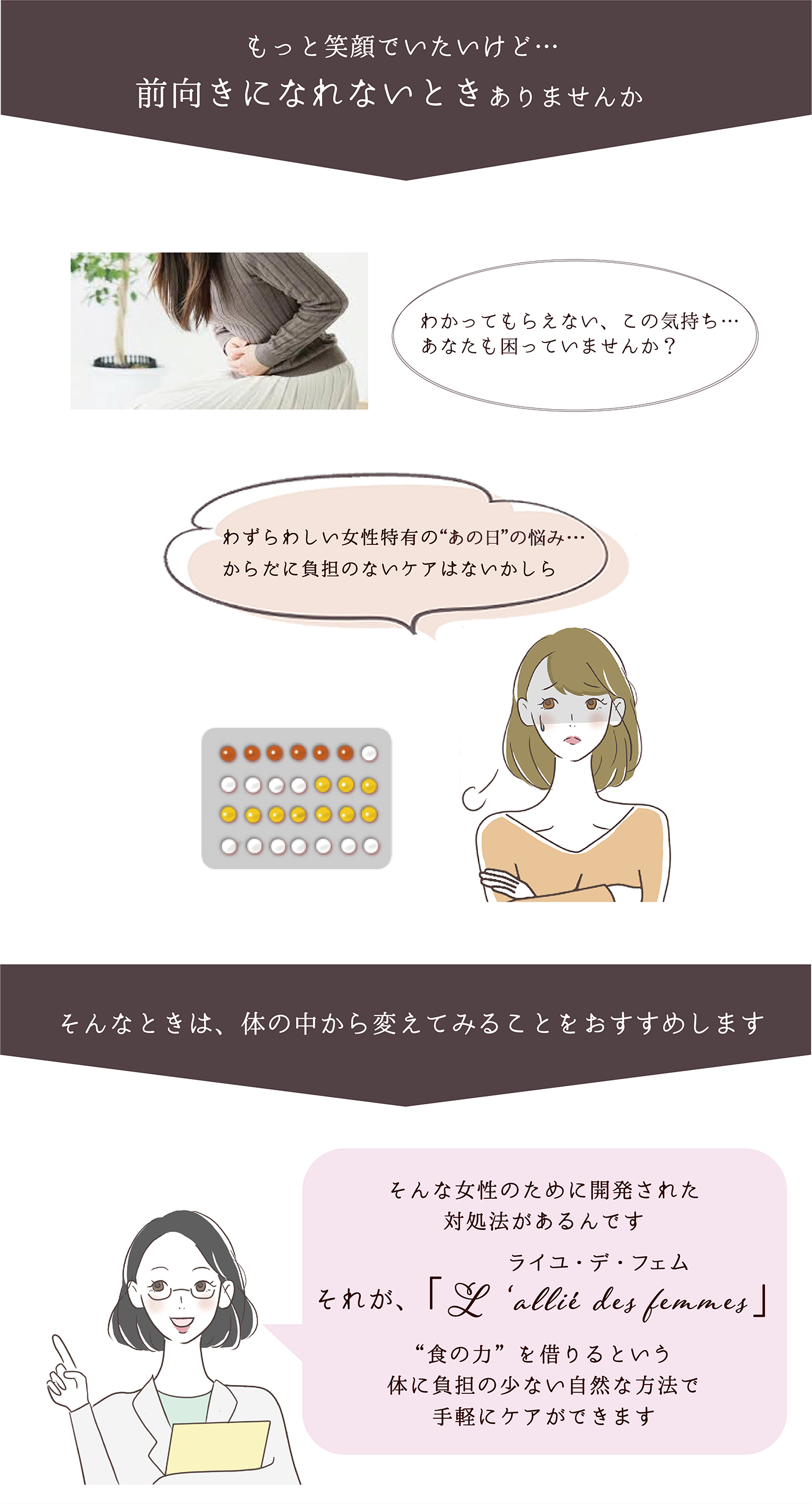 L‘allié des femmes(ライユ・デ・フェム)は女性のリズムを整える為に開発されたコンディショニング・サプリメントです。ゆらぐ女性にやさしく寄り添い、繰り返す女性特有の悩みを“食の力”でサポートします。毎日飲むものだから安心・安全に続けたい、そんな女性の声にお応えしてGender-specific Medicine(性差に配慮した医療)を実践する医師により開発された商品がこのライユ・デ・フェムです。